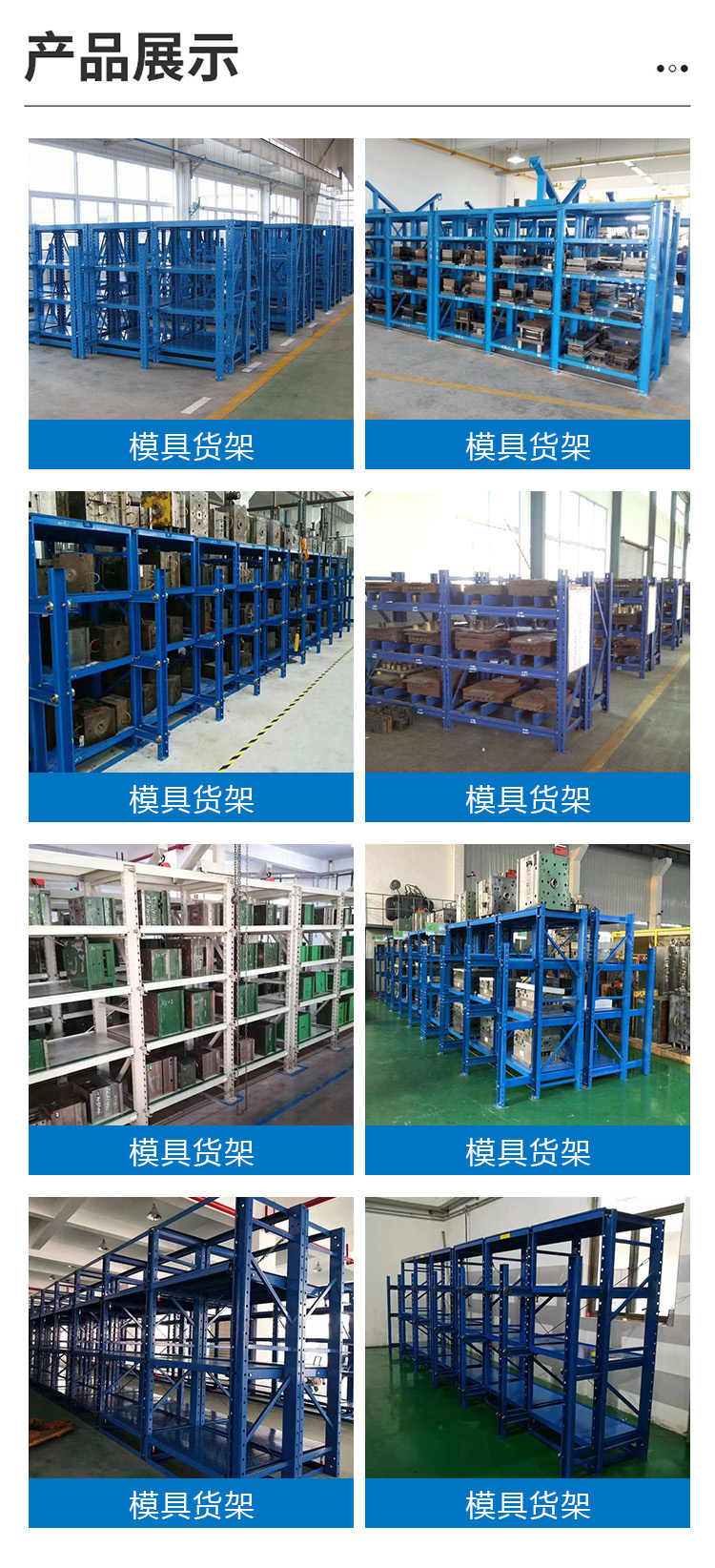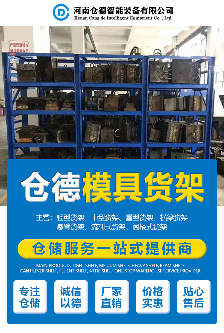 產(chǎn)品描述:模具貨架是貨架的一種,簡稱:模具架。主要存放各種模具物品,根據(jù)承載能力要求分為輕型模具貨架和重型模具貨架。貨架頂部可配置移動葫蘆車,以方便模具的起吊。